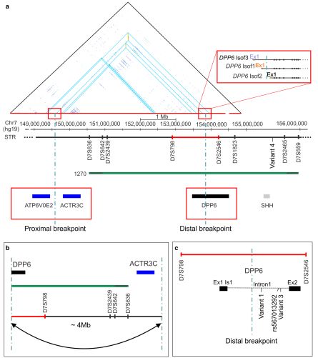作者設(shè)計(jì)引物擴(kuò)增連鎖區(qū)域去證實(shí)這些變異,結(jié)果發(fā)現(xiàn)PCR產(chǎn)物在兩個7號染色體的位點(diǎn)比對到了相反的方向,且距離將近4Mb。7號染色體上的局部比對,證實(shí)了反向雜合低拷貝重復(fù)的出現(xiàn)。遠(yuǎn)端的斷點(diǎn)位于7q36.2連鎖區(qū)域上,DPP6基因的1號內(nèi)含子上,被預(yù)測改變了基因的編碼序列;臨近的倒位斷點(diǎn)位于連鎖區(qū)域之外。