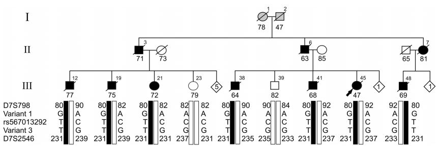 對1270家族的第三代4個患病的兄弟姐妹(III-12,III-38,III-41,III-48)進(jìn)行WGS測序。選擇4個患者共有的注釋的高質(zhì)量的遺傳變異,罕見的(千人基因組計(jì)劃中<1%)或者雜合的非編碼變異進(jìn)行后續(xù)研究。在STR標(biāo)記D7S636和D7S559上連鎖區(qū)域的位點(diǎn)保留了79個非編碼的變異。驗(yàn)證和分離分析保留了38個非編碼變異,這些變異在1270家族的疾病單倍型中共分離。對照個體中的變異的基因型顯示4個變異對于1270家族是唯一的。其中3個變異均位于DPP6基因的1號內(nèi)含子上,另一個變異位于基因間區(qū)(距SHH基因最近,27.3Kb)距離DPP6基因下游908kb。而這四個變異在ENCODE注釋都不具有潛在的高度破壞性。