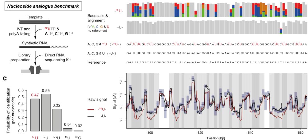 一個主要挑戰(zhàn)是尋找合適的核苷類似物用于RNA標(biāo)記和檢測標(biāo)記的RNA isoform,已知標(biāo)記效率限制在約2-3%,即100個天然核苷酸中只有2個或3個被核苷酸類似物取代。作者利用ERCC標(biāo)準(zhǔn)品,分別以添加核苷酸類似物和不添加的天然堿基作體外轉(zhuǎn)錄,將體外轉(zhuǎn)錄產(chǎn)物進(jìn)行nanopore direct RNA測序,比較了幾種不同的核苷酸類似物:5EU(5-Ethynyluridine,5-乙炔基尿苷)、5BrU(5-bromouridine,5-溴尿苷)、5IU(5-iodouridine,5-碘尿苷)、4sU(4-thiouridine,4-硫代尿苷)和?6sG(6-thioguanine,6-硫鳥嘌呤)。最終結(jié)果表明:5EU和5IU標(biāo)記檢出率比較高,且5EU對細(xì)胞無毒性。且5EU標(biāo)記的新合成RNA中約有一半U可以被識別為5EU,且從原始電信號中可以明顯區(qū)分5EU和天然U堿基。選用5EU進(jìn)行體內(nèi)實驗。