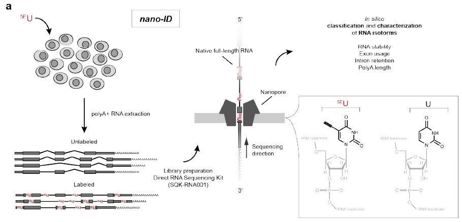 因此作者開發(fā)了nano-ID(nanopore sequencing-based Isoform Dynamics ),其結(jié)合了代謝RNA標(biāo)記、天然RNA分子的“長讀長”納米孔測序和機(jī)器學(xué)習(xí)。