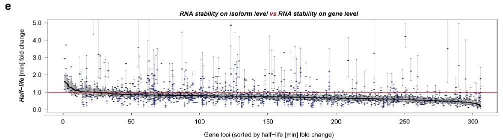 真核基因通常產(chǎn)生多種RNA isoform,其可產(chǎn)生功能上不同的蛋白質(zhì)變體。然而,RNA isoform的合成和穩(wěn)定性鮮少了解。原因是目前量化RNA代謝的方法是不能檢測RNA isoform的“短讀長”測序。