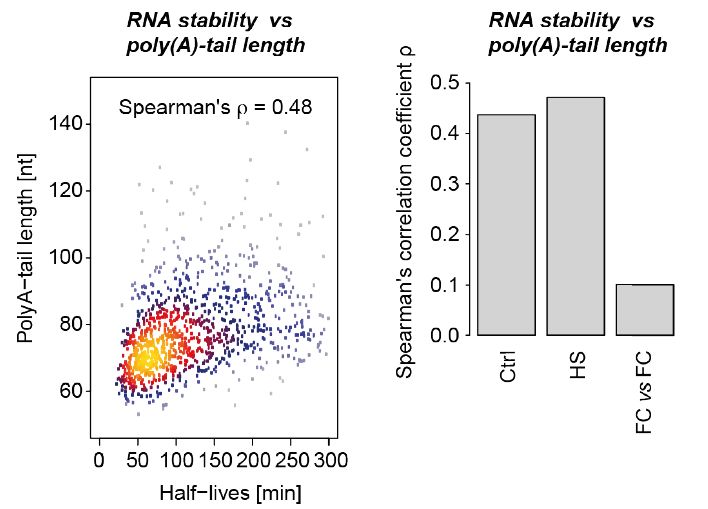 熱休克反應(yīng)(42°C 60min)處理,許多RNA isoform改變了合成速率、穩(wěn)定性和剪接模式。nano-ID分析結(jié)果表明,對于某一個基因座對應(yīng)的組合RNA混合物(基因水平)的代謝變化與單一轉(zhuǎn)錄本代謝變化差異非常大。雖然組合的RNA穩(wěn)定性與poly(A)尾巴長度相關(guān),但是單個RNA isoform可以顯著偏離。nano-ID能夠在不同細(xì)胞狀態(tài)和條件下研究單個RNA分子和isoform水平的RNA代謝。