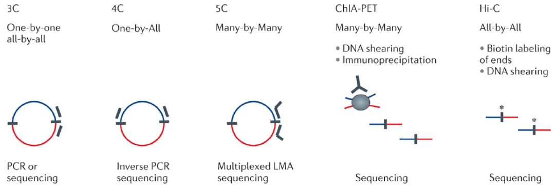同樣源于3C的用以研究染色體互作的技術(shù)還包括4C(“circular?3C”或“3C-on-Chip”)、5C(Chromosome?conformation?capture?carbon?copy)?、ChIA-PET(chromatin?interaction?analysis?by?paired-end?tag?sequencing)?,不同的3C衍生技術(shù)的區(qū)別在于捕獲的連接片段檢測和定量方式。