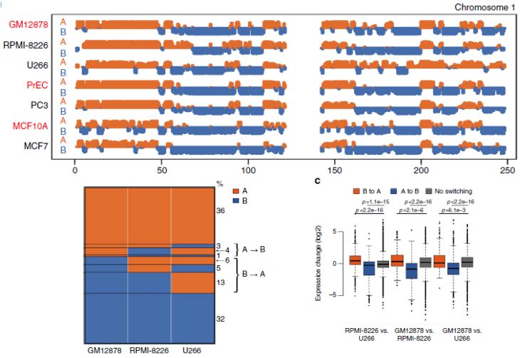 腫瘤細胞系與正常細胞系間A/B?compartment轉(zhuǎn)換(Pengze Wu1,et al,NC)