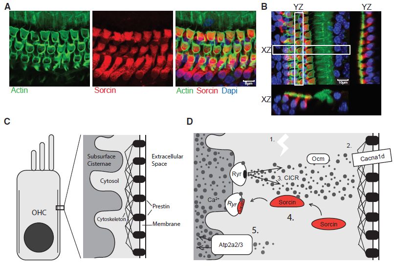 免疫熒光僅將sorcin僅定位于OHC(圖3A,3B),假設(shè)類似的機(jī)制可以調(diào)節(jié)基于prestin的運(yùn)動(dòng)(圖3C和3D,動(dòng)力蛋白?Prestin是一種高度專業(yè)化的蛋白質(zhì),可以起到驅(qū)動(dòng)耳蝸中外部毛細(xì)胞的作用,使耳蝸可以讓人們和動(dòng)物聽到聲音)。與此可能性一致,作者確定了在OHCs中表達(dá)sorcin介導(dǎo)的興奮-收縮途徑的基本組分,包括(1)電壓門控鈣釋放通道,(2)促進(jìn)CICR的通道,(3)終止CICR的機(jī)制(sorcin),和(4)鈣泵使釋放的Ca2+返回Ca2+儲(chǔ)庫(圖3E)。本數(shù)據(jù)集和他人數(shù)據(jù)集中檢測到的第一個(gè)組分是耳聾基因Cacna1d,一種在OHCs中高表達(dá)的電壓門控鈣釋放通道,參與心動(dòng)過緩有關(guān)的綜合征性耳聾;第二個(gè)組分,即促進(jìn)CICR的通道,包括Ryr1、Ryr2和Ryr3。在通過Ryr通道誘導(dǎo)CICR后,sorcin的作用可能是通過在Ca2+存在下阻斷Ryr受體來快速終止CICR,這是先前在心肌細(xì)胞中報(bào)道的途徑。已知定位于OHC表面下池的Ca2+?ATP酶泵可從細(xì)胞溶質(zhì)中除去Ca2+。附著蛋白質(zhì)(Ocm)等結(jié)合并緩沖Ca2?+的輔助蛋白質(zhì)可能有助于這一過程。