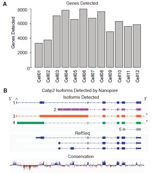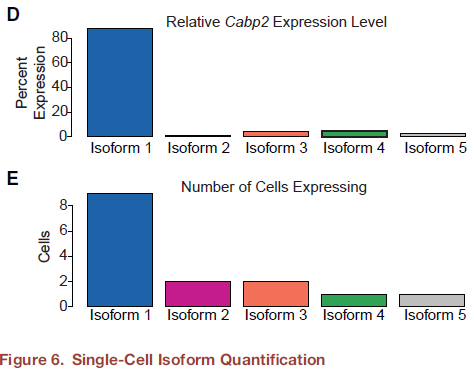 為了解決全長isoform結(jié)構(gòu),進(jìn)行了ONT全長轉(zhuǎn)錄組測序,并使用Illumina短reads序列數(shù)據(jù)作為確認(rèn)的scaffold,用于nonopore長讀長數(shù)據(jù)比對(duì)。與150-800bp片段大小的Illumina?reads不同,Nanopore測序不需要片段化文庫,并且可以產(chǎn)生跨越mRNA轉(zhuǎn)錄本長度的單一reads(圖6A和6B)。對(duì)p15時(shí)間點(diǎn)的12個(gè)OHC細(xì)胞加barcaod以在4個(gè)MinION?R9.4?flow?cell上測序所有樣品,同時(shí)保持單細(xì)胞分辨率(圖6A)。因?yàn)镺HCs是最多和最差異的Illumina數(shù)據(jù)集,這有助于跨平臺(tái)比較以驗(yàn)證長reads和isoform定量。