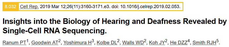 參考文獻(xiàn):Ranum?P?T,?Goodwin?A?T,?Yoshimura?H,? et?al.?Insights?into?the?Biology?of?Hearing?and?Deafness?Revealed?by? Single-Cell?RNA?Sequencing[J].?Cell?reports,?2019,?26(11):?3160-3171.? e3.
