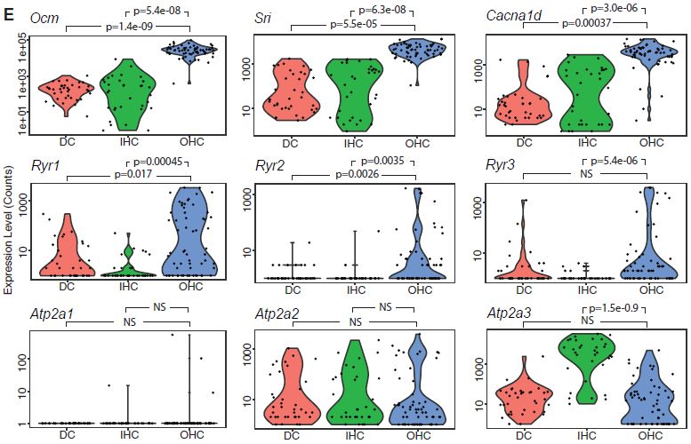 已知細(xì)胞類型marker基因高度差異表達(dá),例如prestin(Slc26a5),其在OHCs中穩(wěn)健且差異表達(dá)。與公布的OHC和IHC轉(zhuǎn)錄組數(shù)據(jù)進(jìn)行比較,搜索具有不一致排名的基因,假設(shè)通過AUC而不是表達(dá)水平對(duì)基因進(jìn)行排序?qū)⒃诟鼜V泛的表達(dá)水平上鑒定細(xì)胞類型定義基因。按AUC分類排名時(shí),兩個(gè)鈣相關(guān)基因Ocm和Sri在OHC定義基因列表中排名第一,甚至超過Slc26a5,排名第三(上圖2F)。先前已在OHC中報(bào)道了Ocm的表達(dá)。編碼蛋白質(zhì)oncomodulin(癌調(diào)蛋白)是鈣結(jié)合蛋白家族成員之一,它是耳蝸聽力擴(kuò)增所必需的。Sri編碼sorcin(可溶性耐藥相關(guān)鈣結(jié)合蛋白),一種在心肌細(xì)胞中表達(dá)的蛋白質(zhì),是鈣介導(dǎo)的興奮-收縮偶聯(lián)所必需的,通過抑制Ryr通道(Ca2+釋放通道/RyR受體)進(jìn)行鈣離子介導(dǎo)的鈣離子釋放?(CICR)。在肌細(xì)胞中,Ryr通道介導(dǎo)CICR,能夠從肌質(zhì)網(wǎng)中快速釋放Ca2+離子,從而產(chǎn)生對(duì)于肌肉收縮必不可少的時(shí)空限制性鈣火花。