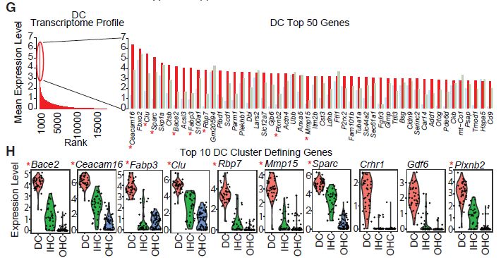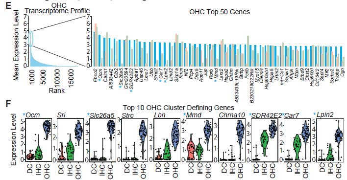 • 單細(xì)胞RNA-seq可鑒定內(nèi)毛細(xì)胞(inner?hair?cells,IHCs)和外毛細(xì)胞(outlier?hair?cells,OHCs)定義基因;