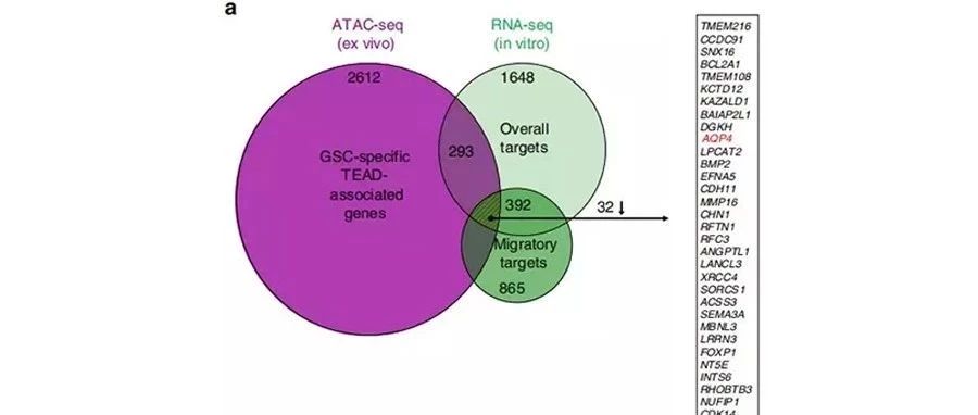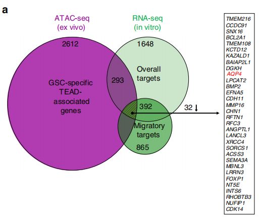 GSC中TEAD1可接近區(qū)域peak(ATAC-seq)和基因表達水平(RNA-seq)的一致性分析,結合GBM中TEAD1與基因共表達(TCGA中的GBM RNA-seq數據)分析,發(fā)現(xiàn)TEAD1的靶基因包括EGFR、AQP4、CDH4、TNC等多個候選靶基因。