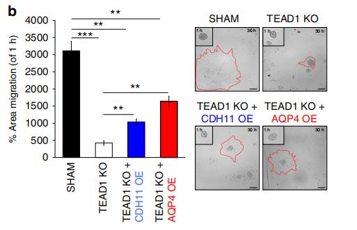 作者通過ATAC-seq和轉錄組測序數據篩選出來TEAD1的候選靶基因,并進一步利用ChIP-PCR,驗證了與TEAD1結合的靶基因–AQP4、EGFRCDH4。TEAD1敲除使AQP4下調,TEAD1過表達可恢復AQP4的表達,而TEAD1和AQP4過表達均可修復TEAD1KO細胞的遷移缺陷,說明TEAD1作用于靶基因AQP4,調控其表達,進而參與GBM遷移的直接調控機制。