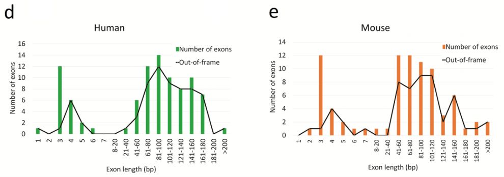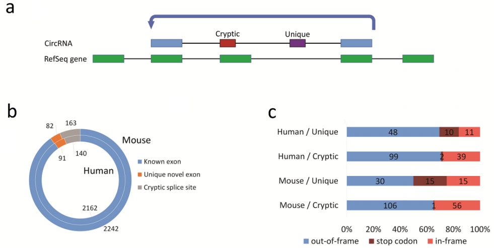 將circRNA根據(jù)新外顯子使用分類為“隱蔽的circRNA外顯子”(與注釋的外顯子共享5’或3’剪接位點)或“獨特的circRNA外顯子”(全新的外顯子)。人類2,393個外顯子中的91個和小鼠中2,487個外顯子中的82個是獨特的circRNA外顯子,140和163個分別是隱蔽的circRNA外顯子。(所有單外顯子circRNA都被排除在該分析之外,因為在單個read中需要完全覆蓋檢測到的外顯子,這對于單個外顯子circRNA而言在技術上是不可能的。)作者發(fā)現(xiàn)大多數(shù)獨特的circRNA外顯子在40-200bp范圍內,但也經(jīng)常觀察到3-6bp的非常短的外顯子(微外顯子)組。有趣的是,大多數(shù)circRNA特異性外顯子導致移碼突變或終止密碼子獲得,可能解釋了它們在線性mRNA翻譯中缺失,因此受到無義介導降解。