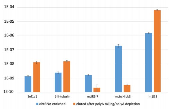 只有一小部分RNA是環(huán)狀的(例如,小鼠神經(jīng)系統(tǒng)中去rRNA的RNA庫中僅占約0.1%)。作者采用上述方法進行circRNA-ONT測序,由于有些線性RNA分子對RNase R具有抗性,故而此方法比普通的去線性circRNA建庫多了一步:將剩余的線性RNA多聚腺苷酸化(poly A tailing)并使用poly(A)純化磁珠去除帶polyA尾的RNA分子。結果表明,該步驟使circRNA強烈富集。
