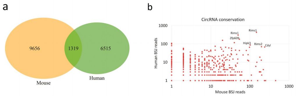人和小鼠circRNA文庫的納米孔測序分別產(chǎn)生0.67M和1.06M reads,其中3.2%和3.3%跨越circRNA BSJ(Back splice junction)位點。人和小鼠中分別鑒定到7,834和10,975個circRNA,其中1,319個在人和鼠中保守的circRNA。在最高表達和保守的circRNA中,發(fā)現(xiàn)眾所周知的腦circRNA,例如circRims1、circRims2、circHipk3、circCdyl和circZfp609。整個數(shù)據(jù)集中,分別來自人和小鼠的2,945和7,052個circRNA先前未在circBase中注釋。