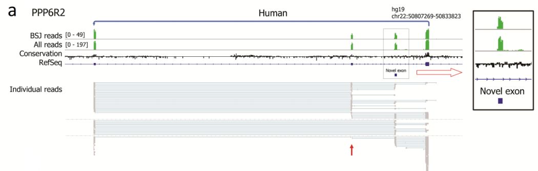 Rahimi K, Veno M T, Dupont D M, et al. Nanopore sequencing of full-length circRNAs in human and mouse brains reveals circRNA-specific exon usage and intron retention[J]. BioRxiv, 2019: 567164.