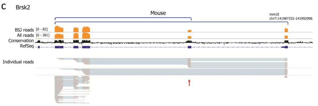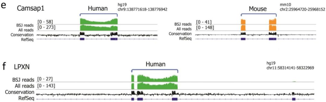 將所有小鼠和人跨越BSJ reads與各自的參考基因組比對,并定量比對到外顯子或內含子區(qū)域的堿基對的數(shù)量。為了將分析集中于更豐富的circRNA中的內含子保留和其他可變剪接事件,僅進一步研究了具有10個或更多BSJ reads并具有高于3%的平均內含子百分比的circRNA。作者發(fā)現(xiàn)3個人和4個小鼠circRNA具有內含子保留,而39和57個circRNA包含分別在人和小鼠的RefSeq中未注釋的外顯子序列。CAMSAP1 是circRNA內含子保留實例,其僅發(fā)生在人RNA中;LPXN circRNA是僅在人中表達的circRNA。