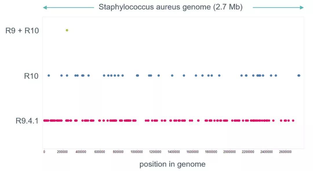 官方通過檢測(cè)同一樣本R10和R9.4.1中的錯(cuò)誤在基因組上的情況,發(fā)現(xiàn)R9.4.1與R10的錯(cuò)誤在基因組上分布并不是完全重疊的,通過兩種版本芯片的數(shù)據(jù)進(jìn)行混合分析,可極大地提高序列的準(zhǔn)確性(圖6)。這表明了,在不使用二代數(shù)據(jù)的前提下,后續(xù)也可考慮通過R10和R9.4.1數(shù)據(jù)組合的方式來提高結(jié)果的準(zhǔn)確度!