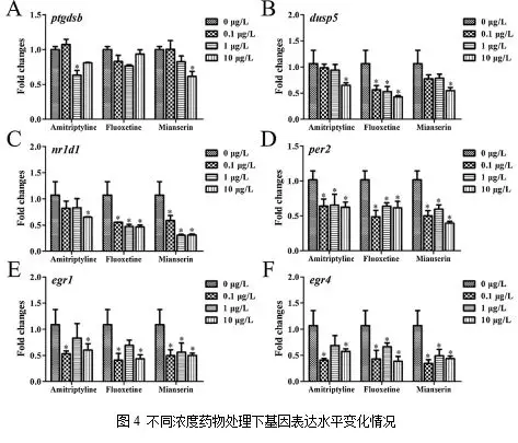 作者用三種不同濃度的抗抑郁藥(0.1、1和10 μg /L)處理斑馬魚胚胎,應(yīng)用qPCR試驗(yàn)確定6個(gè)選定的基因的濃度—應(yīng)答關(guān)系。結(jié)果表明,ptgdsb的mRNA水平只在1 μg /L阿米替林和10 μg /L米安色林處理組顯著降低;而dusp5表達(dá)水平在10 μg /L阿米替林和米安色林處理組以及所有氟西汀處理組中均顯著降低;除了在1和10 μg /L阿米替林處理組中的nr1d1表達(dá)水平未受抑制之外,nr1d1和per2在幾乎所有抗抑郁藥物處理組均受到顯著抑制。此外,兩個(gè)與早期生長應(yīng)答相關(guān)的基因egr1和egr4在0.1和10 μg /L阿米替林處理組和所有米安色林處理組中表達(dá)下調(diào),egr4在所有氟西汀處理組降低,而egr1只在0.1和10 μg /L氟西汀處理組中表達(dá)降低(圖4)。