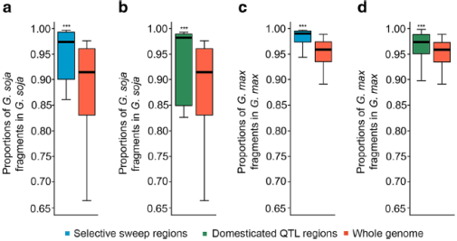 相較于在野生大豆種質(zhì)中檢測到的基因組其他區(qū)域,與選擇性掃描區(qū)域相應(yīng)區(qū)域中的栽培大豆片段比例顯著降低(圖5a)。相比之下,與栽培大豆基因組相比,選擇性掃除區(qū)中野生大豆片段在基因組其他區(qū)域的檢出率顯著降低(圖5c)。在栽培大豆或野生大豆相應(yīng)馴化QTL區(qū)域中,滲入片段比例比選擇性掃描區(qū)域中檢測到的小(圖5b,d)。這些結(jié)果表明雙向選擇,即自然選擇與人工選擇,對野生大豆和栽培大豆中滲入片段的保留具有不同的結(jié)果、影響。