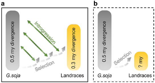 基因滲入被認(rèn)為是基因流的主要途徑,那么基因流如何在種群水平上影響馴化過程和大豆基因組的遺傳結(jié)構(gòu)?現(xiàn)有研究已分離出分別控制種子硬度和種皮開花的關(guān)鍵大豆馴化基因GmHs1-1和Bloom1(B1),圍繞GmHS1-1、Gmhs1-1和B1、b1基因座的兩個選擇性掃除區(qū)域中的SNP分析系統(tǒng)發(fā)育關(guān)系發(fā)現(xiàn)基因滲入現(xiàn)象在這兩個區(qū)域均有存在??紤]到野生大豆和栽培大豆亞種的系統(tǒng)發(fā)育差異,在研究種群中兩個馴化基因位點檢測到的選擇性掃描區(qū)域和單倍型的混合將被視為亞種群間基因流動的進(jìn)一步證據(jù)。