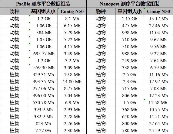 同時(shí)通過PacBio和Nanopore雙平臺測序數(shù)據(jù)組裝結(jié)果的比較發(fā)現(xiàn),利用PacBio數(shù)據(jù)進(jìn)行基因組組裝Contig N50一般達(dá)到Mb級別,而利用Nanopore數(shù)據(jù)進(jìn)行基因組組裝,Contig N50指標(biāo)平均水平基本能再提升2倍或者更高,甚至許多物種能達(dá)到幾十Mb(如百邁客利用Nanopore測序平臺組裝的水產(chǎn)動物綠鰭馬面鲀基因組,Contig N50高達(dá)22 Mb)。