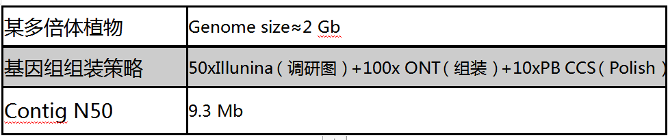 由于Nanopore測序Reads讀長長,PacBio Sequel II HiFi模式測序準(zhǔn)確性高達(dá)99%以上,為了同時(shí)利用其雙平臺各自的優(yōu)勢,我們擬通過Nanopore測序數(shù)據(jù)對某多倍體植物進(jìn)行基因組組裝,同時(shí)通過低深度PacBio CCS數(shù)據(jù)進(jìn)行Polish,進(jìn)而對該多倍體植物基因組連續(xù)性,完整性及準(zhǔn)確性進(jìn)行評估,以獲得高連續(xù)性,高準(zhǔn)確的基因組密碼信息,測試結(jié)果如下: