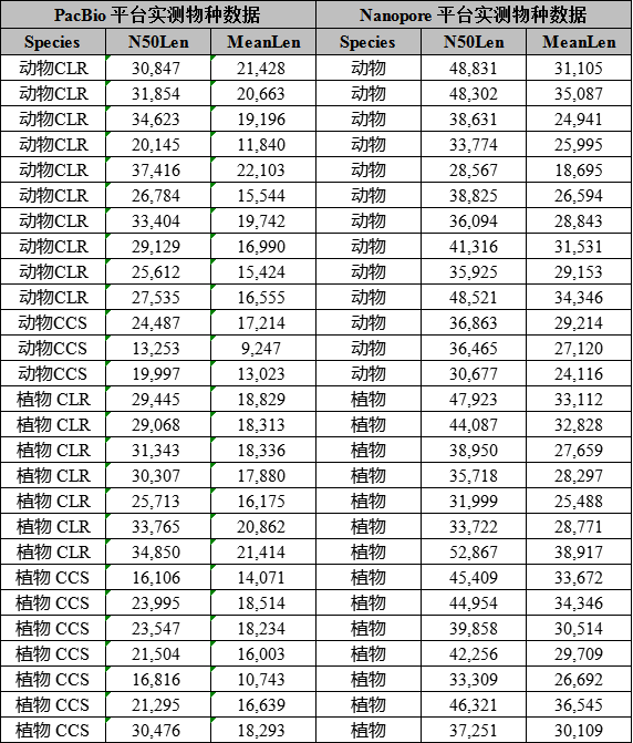 表1 Nanopore與PacBio平臺實(shí)測物種數(shù)據(jù)讀長比較