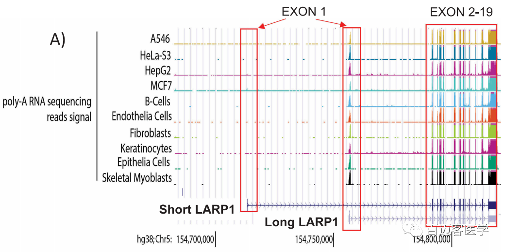 使用LARP1各個區(qū)域的抗體進(jìn)行的蛋白質(zhì)印跡WB實(shí)驗(yàn)產(chǎn)生了大約150/130kDa的雙鏈帶,這被解釋為代表了2種LARP1亞型。為了探索這一點(diǎn),作者系統(tǒng)地進(jìn)行了一系列計算機(jī)、轉(zhuǎn)錄組、生化和細(xì)胞分析,以闡明LARP1在癌癥和正常細(xì)胞中的真實(shí)表達(dá)情況。