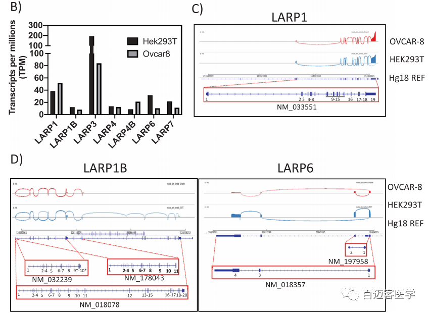 Nanopore全長轉(zhuǎn)錄組測序:為了進(jìn)一步了解LARP1 isoform的表達(dá),在HEK-293 T和OVCAR-8細(xì)胞(永生化的人類胚胎腎細(xì)胞和卵巢癌細(xì)胞系)中分別進(jìn)行了牛津納米孔測序技術(shù)(ONT全長轉(zhuǎn)錄組測序)(圖2B-D)。這種RNA直接測序技術(shù)可以檢測長讀長轉(zhuǎn)錄本isoform,并可以無PCR偏倚地定量轉(zhuǎn)錄本豐度。與人類基因組(Hg38)比對,并使用IGV可視化。在HEK-293T細(xì)胞中,檢測到總共2,038,842個轉(zhuǎn)錄本,而在OVCAR-8細(xì)胞的樣品中僅檢測到1,834,870個轉(zhuǎn)錄本。(根據(jù)百邁客的項(xiàng)目經(jīng)驗(yàn)大概每個樣本2G多的數(shù)據(jù)量)作者對所有比對到7個LARP家族成員的轉(zhuǎn)錄本進(jìn)行表達(dá)定量,校正各樣本數(shù)據(jù)量差異將其標(biāo)準(zhǔn)化為TPM(transcripts per million,每百萬轉(zhuǎn)錄本)(圖2B)。在LARP家族成員中,LARP3的轉(zhuǎn)錄本表達(dá)量最高(TPM=194)。相反,其他LARPs的表達(dá)值TPM遠(yuǎn)低于50,其中LARP1B和LARP4B的表達(dá)最低。且與前人研究一致,致癌性LARP1在OVCAR-8癌細(xì)胞(TPM 52)中的表達(dá)水平高于HEK-293 T細(xì)胞(TPM 38)中的表達(dá)水平。為了分析LARP1 sioform在這些細(xì)胞中的表達(dá),作者使用Sashima圖(圖2C)可視化剪接位點(diǎn)。使用這種RNA直接測序的nanopore全長轉(zhuǎn)錄組方法,在2個測試的細(xì)胞系中均未檢測到SI-LARP1。盡管LARPs的表達(dá)水平低于其他基因,例如GAPDH(在OVCAR-8細(xì)胞中TPM高達(dá)6396),因此LI-LARP1被鑒定為主要表達(dá)的LARP1亞型。作者還觀察到5′截短的LARP1轉(zhuǎn)錄本積累,LARP1B的3種isoform共表達(dá)(NM-018078,NM_178043,NM-032239),LARP6的2種isoform共表達(dá)(NM_197958,NM_018357)(圖2D)。對于其他LARP,能夠確認(rèn)ONT測序檢測到的主要轉(zhuǎn)錄本與經(jīng)典isoform相對應(yīng)。