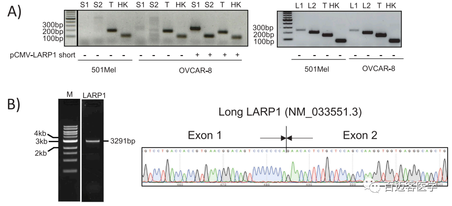 3、特異性引物擴(kuò)增及sanger測序驗(yàn)證SI-LARP1和LI-LARP1 isoform表達(dá)情況:501-MEL(黑色素瘤細(xì)胞系)和OVCAR-8細(xì)胞中只表達(dá)LI-LARP1;