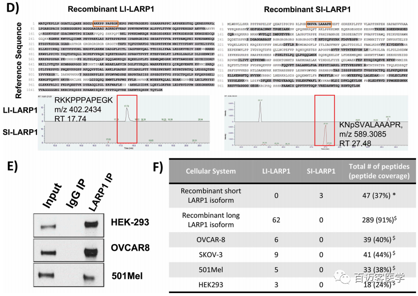 為了驗(yàn)證這一點(diǎn),首先,在OVCAR-8細(xì)胞中異位表達(dá)了2種LARP1 isoform,并使用針對共表達(dá)的Xpress標(biāo)簽的抗體從粗蛋白裂解物中免疫沉淀富集LARP1蛋白(圖4C)–pull down實(shí)驗(yàn)。隨后,使用胰蛋白酶或胰凝乳蛋白酶對樣品進(jìn)行溶液消化后,Shotgun LC MS/MS質(zhì)譜分析以鑒定對應(yīng)于SI-或LI-LARP1 isoform的N端特異性肽段。鑒定了從序列位置45和46產(chǎn)生的3種肽(質(zhì)量為N46SVALAAAPR:485.2773 Th(m/z); K45NpSVALAAAPR:549.3257 Th(m/z); K45NSAVALAAAPR:589,3085 Th(m/z ))作為SI-LARP1的唯一特征(圖4D)。相反,對于LI-LARP1,鑒定了由與外顯子1對應(yīng)的蛋白質(zhì)序列產(chǎn)生的152個肽。第二步,免疫沉淀富集OVCAR-8、501-MEL、SK-OV-3和HEK-293T細(xì)胞的內(nèi)源LARP1,并進(jìn)行質(zhì)譜分析,使用監(jiān)督自動算法檢測預(yù)先指定的isofrom特異性肽(圖4E-F)。LARP1的肽覆蓋率范圍為內(nèi)源性免疫沉淀蛋白的24-44%。盡管在所有4個細(xì)胞系中都鑒定出了與LI-LARP1 N端相對應(yīng)的獨(dú)特肽,但我們無法在任何樣品中鑒定出對SI-LARP1亞型具有特異性的任何肽。這些結(jié)果與觀察到的不存在對應(yīng)于SI-LARP1的mRNA相一致。
