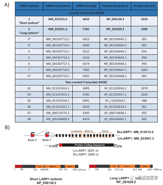 圖1A為NCBI基因數(shù)據(jù)庫中列出的9種不同的LARP1經(jīng)驗(yàn)證的isoform。LARP1典型轉(zhuǎn)錄本為NM_015315.5,編碼1019個氨基酸(NP_056130.2)的蛋白質(zhì),在此處稱為“ SI-LARP1”。UniProtKB數(shù)據(jù)庫引用了另一個比較長的轉(zhuǎn)錄本NM_033551.3作為LARP1的規(guī)范形式,它對應(yīng)于1096個氨基酸蛋白(NP_291029.2),在此稱為“LI-LARP1” 。SI-LARP1蛋白與LI-LARP1不同,它缺少前77個氨基酸,并且氨基酸M1至N67不同。