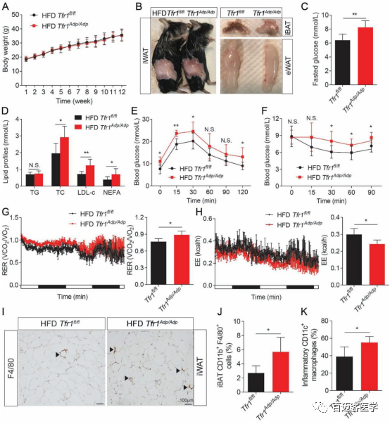 為了進(jìn)一步探究Tfr1基因在棕色/米色脂肪細(xì)胞的發(fā)育和產(chǎn)熱能力維持的過程的作用機(jī)制。分別對(duì)Tfr1Adp/Adp和Tfr1fl/fl 進(jìn)行高脂肪、正常喂養(yǎng),并對(duì)4組樣本分別進(jìn)行葡萄糖耐量、胰島素抵抗、呼吸速率、能量消耗、CD11b+F4/80巨噬細(xì)胞、CD11c+巨噬細(xì)胞的比例等實(shí)驗(yàn)。數(shù)據(jù)表明在高脂肪處理實(shí)驗(yàn)組 中,整體體重(Fig3 A)、白色脂肪組織(Fig3 B)大小都沒有明顯的差異。然而在高脂實(shí)驗(yàn)組中棕色脂肪組織完全轉(zhuǎn)化為白色脂肪組織(Fig3 B)。同時(shí)小鼠空腹血糖、血脂、非酯化脂肪酸脂肪酸的含量明顯高于高脂對(duì)照組。高脂喂養(yǎng)后,盡管血液中血糖含量沒有太大的變化,但是驗(yàn)組中葡萄糖耐量、胰島素抵抗的值都要高于高脂對(duì)照組(Fig3E/F)。這說明高脂實(shí)驗(yàn)組中糖耐受性受損可能是導(dǎo)致空腹血糖升高的原因。而呼吸速率、能量消耗的實(shí)驗(yàn)表明缺失Tfr1基因后呼吸速率會(huì)增加,能量消耗能力降低(Fig3G/H)。在正常喂養(yǎng)的實(shí)驗(yàn)組中白色脂肪組織相對(duì)于正常對(duì)照組來說明顯減少。 上述數(shù)據(jù)表明,能量消耗降低并沒有導(dǎo)致高脂喂養(yǎng)實(shí)驗(yàn)組小鼠體重增加,可能是由于Tfr1缺失對(duì)白色脂肪細(xì)胞的內(nèi)在的影響。