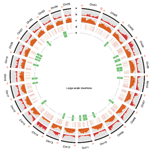 2018年5月8日,中國農(nóng)業(yè)科學(xué)院棉花研究所所長李付廣研究員、武漢大學(xué)朱玉賢院士、中國農(nóng)業(yè)科學(xué)院棉花研究所杜雄明研究員、中國農(nóng)業(yè)科學(xué)院農(nóng)業(yè)基因組研究所所長黃三文研究員、林濤博士與北京百邁客生物科技有限公司關(guān)于亞洲棉的合作成果發(fā)表在Nature Genetics上。利用三代PacBio測序+Hi-C技術(shù)完成了亞洲棉基因組的重新組裝,將基因組Contig N50從72 kb提升到1.1 Mb,并將91.98%的序列掛載至染色體水平上,為亞洲棉后續(xù)的群體遺傳學(xué)等相關(guān)研究奠定了基礎(chǔ)[5]