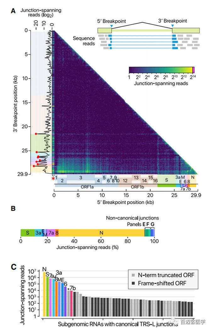 用DNB-seq確認和檢查CoV基因組的junctions。在junctions處繪制了5’和3’斷點,并通過計算跨越junctions的reads來估算融合頻率(圖2A)。如所預期的,leader代表了最突出的5’ 位點(圖2A,x軸上的紅色星號)。TRS-B被檢測為3’位點的頂端(圖2A,y軸上的紅點)。這些結(jié)果證實,SARS CoV-2使用標準的TRS介導的模板轉(zhuǎn)換機制進行不連續(xù)轉(zhuǎn)錄,以產(chǎn)生主要的sgRNA(圖2B)??缭絡unctions reads的定量比較顯示,N RNA是表達最豐富的轉(zhuǎn)錄本,其次是S,7a,3a,8,M,E,6和7b(圖2C)。