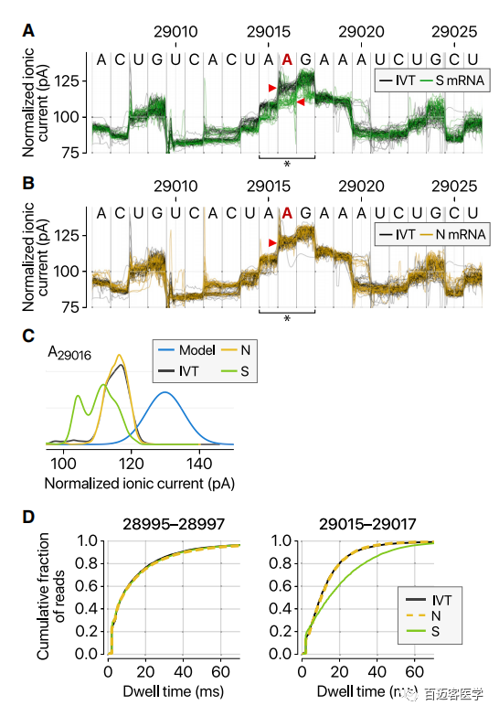 研究人員用DRS數(shù)據(jù)檢測了SARS-CoV-2的表觀轉(zhuǎn)錄組學。病毒RNA修飾在40多年前就已描述過(Gokhale and Horner,2017)。為了明確研究RNA修飾,作者通過體外轉(zhuǎn)錄病毒序列生成了陰性對照RNA,并對陰性對照進行了直接RNA測序。注意到陰性對照和病毒轉(zhuǎn)錄本之間的離子電流之間的差異非常有趣(圖6A)。至少有41個位點顯示出實質(zhì)性差異(頻率超過20%),表明存在潛在的RNA修飾位點。值得注意的是,某些位點顯示的頻率取決于sgRNA的種類。圖6A–6C,S RNA上比N RNA修飾的位點更多,與S RNA相比ORF8 RNA上的修飾頻率更高。此外,修飾的堿基(圖6D,右)的停留時間比未修飾的堿基(圖6D,左)的停留時間長,表明修飾會干擾RNA分子過孔速度。