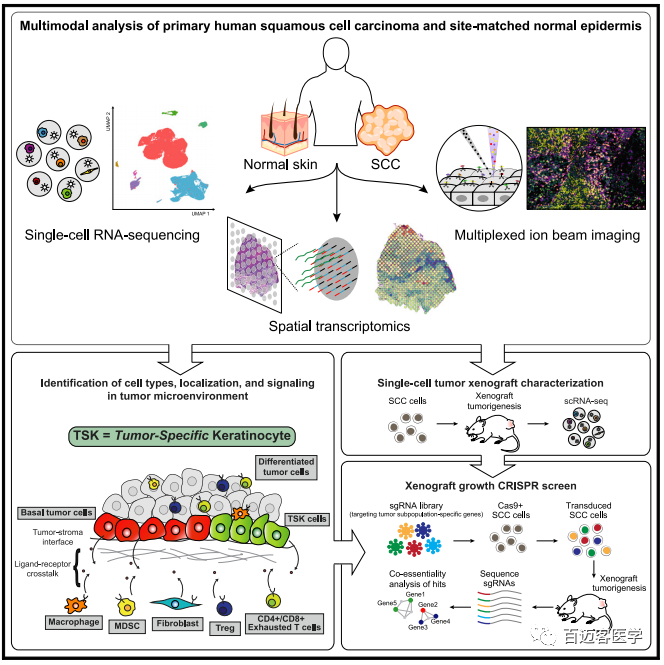 本文整合單細胞RNA測序、空間轉(zhuǎn)錄組和多路離子束成像繪制了人類鱗狀細胞癌組成和空間結構的多模式圖譜,發(fā)現(xiàn)了一個定位于腫瘤前沿的腫瘤特異性角化細胞(TSKs)。TSK在腫瘤微環(huán)境的機制探索,體內(nèi)CRISPR篩選確定的腫瘤亞群致瘤基因網(wǎng)絡,為腫瘤和免疫動力學研究提供了極大支持。