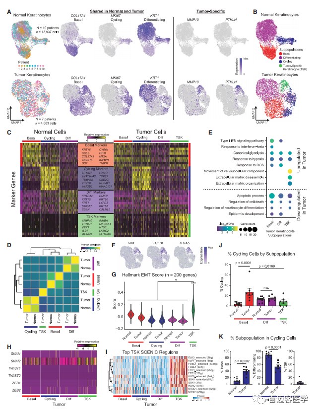 重新聚類正常上皮細胞后,在正常皮膚中觀察到3個主要的角質(zhì)細胞(KC)亞群(基底、循環(huán)、分化細胞)。典型相關分析表明腫瘤KCs廣泛重現(xiàn)了正常(基底、循環(huán)、分化細胞)亞群,在正常皮膚和cSCC中有幾個共享的標記基因(圖2A-D)。有趣的是,在腫瘤細胞聚類中出現(xiàn)了與正常皮膚無明顯關聯(lián)的第四個KC亞群,即TSK亞群(圖2B-D)。事實上,在這一簇與其他腫瘤細胞區(qū)別開來的100個基因中,有99個基因在腫瘤組織中的表達明顯高于正常組織。TSK標記基因與細胞運動和細胞外基質(zhì)分解有關,暗示了它的侵入性(圖2E)。TSKs表達經(jīng)典的上皮-間質(zhì)轉(zhuǎn)化(EMT)標志物,如VIM和ITGA5(圖2F);但是EMT類似的TSK細胞缺乏經(jīng)典表達EMT轉(zhuǎn)錄因子(圖2H)。因此,我們通過單細胞調(diào)控網(wǎng)絡進行推理和聚類,提名AP1和ETS家族成員為潛在控制TSKs的TFs(圖2I)。TSK細胞也表現(xiàn)出較大的EMT評分范圍,提示細胞狀態(tài)具備高可塑性(圖2G),與EMT連續(xù)模型一致。基底細胞(Basal)在腫瘤中的發(fā)生率約是正常循環(huán)細胞的四倍(圖2K)??偟膩碚f,cSCC表現(xiàn)出分化失常,基底細胞迅速增殖,并出現(xiàn)表達EMT連鎖基因的TSK亞群。