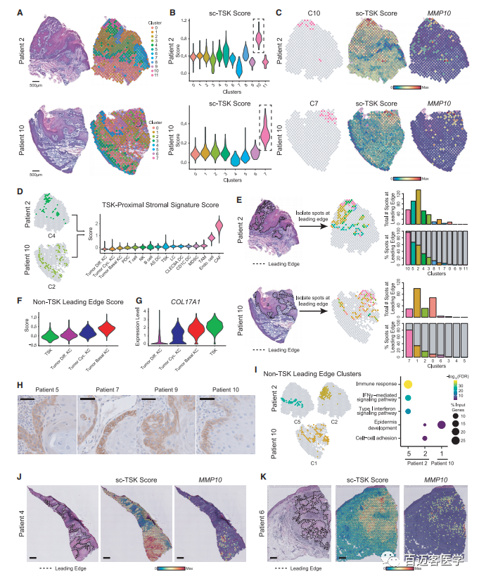 在患者中,腫瘤相關的斑點簇展現(xiàn)出單細胞測序腫瘤KCs的定位基因表達,同時免疫或間質(zhì)基因與腫瘤臨近間質(zhì)、未受累的間質(zhì)或附件區(qū)域有關聯(lián),與大體的cSCC結構一致(圖3A)。使用scRNA-seq中TSK標記基因?qū)γ總€空間轉(zhuǎn)錄組斑點評分,顯著突出了一個TSK-high簇,包括TSK標記物MMP10(圖3B&C)。在具有清晰前沿的腫瘤中,TSK鄰近間質(zhì)富集了癌癥相關成纖維細胞 (CAF)和內(nèi)皮細胞轉(zhuǎn)錄本,表明TSK細胞主要位于纖維血管微環(huán)境中(圖3D)。超過80%的TSK高簇點位于腫瘤前沿,其余的前沿點富集了Basal腫瘤基因(圖3E&F),這種共存關系通過共表達標志物COL17A1的免疫組化得到進一步確認(圖3G&H)。此外,炎癥反應和干擾素信號基因在非TSK前沿表達,與干擾素相關轉(zhuǎn)錄本在腫瘤基底群體中的存在一致(圖2E&I)。這些結果確定了TSK、Basal細胞以及TSK近端纖維血管生態(tài)位造成的cSCC腫瘤前沿的異質(zhì)性。