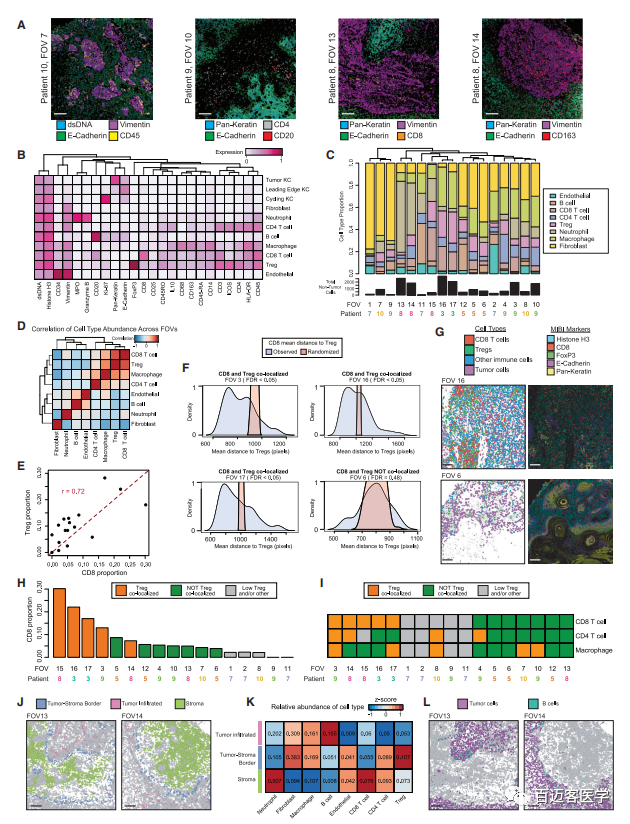 利用多重離子束成像(MIBI)技術,在單細胞分辨率下解析TME的空間組織。我們對6例患者的腫瘤前緣進行了18個視野的MIBI掃描,對38個腫瘤和基質(zhì)/免疫蛋白標志物圖像進行分段,確定了55832個細胞(圖5A),并且聚類分析的主要細胞類型與scRNA-seq細胞類型相似(圖5B)。間質(zhì)和免疫組分在腫瘤內(nèi)和腫瘤間是可變的,12/17的腫瘤患者圖像聚類不一致(圖5C)。腫瘤內(nèi)外的CD8 T細胞、Tregs、巨噬細胞和CD4 T細胞存在高度相關性,尤其前兩者更甚(圖5D)。5/12視野具備足夠的細胞進行系統(tǒng)分析CD8 T細胞和Tregs距離(圖5F-H),我們發(fā)現(xiàn)了兩者的共定位,并且CD8 T細胞的比例也與共定位呈正相關,表明Tregs受到TME的共招募和CD8 T細胞的共定位共同調(diào)節(jié),另外CD4 T細胞和巨噬細胞與Tregs共定位(圖5I)。成纖維細胞、巨噬細胞和Tregs在腫瘤-間質(zhì)邊緣最豐富,而CD8 T細胞和中性粒細胞被大量排除在腫瘤之外,表明 Treg 定位可能阻止效應淋巴細胞進入腫瘤(圖5J&K)。已經(jīng)被發(fā)現(xiàn)可以介導免疫抑制或抗腫瘤活性B細胞是唯一表現(xiàn)出優(yōu)先浸潤的細胞類型。