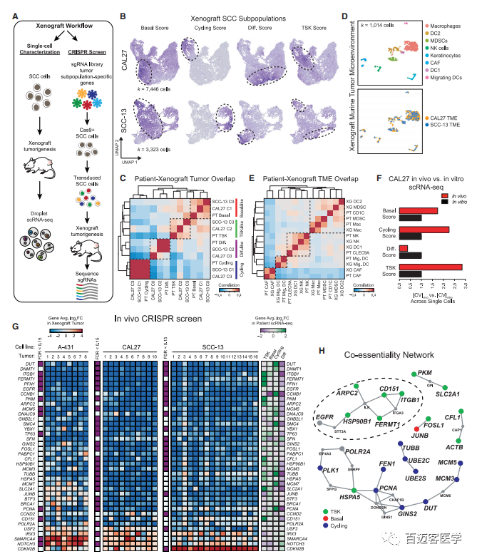 接下來,使用CRISPR/Cas9技術對3個鱗狀細胞癌移植瘤株進行篩選(4個亞群,334個富集基因),評估腫瘤KC亞群的功能作用(圖7A)。通過STARS算法,獲得38個命中點,其中18個至少被兩種細胞系共享(圖7F)。特別的,對腫瘤生長重要的基因偏向于在TSK、基底和循環(huán)細胞中表達。腫瘤循環(huán)KCs特有的參與細胞循環(huán)的基因形成了以PCNA和GINS2為中心的最大網(wǎng)絡。最大的TSK特異性網(wǎng)絡包括ITGB1、FERMT1、CD151、ARPC2、HSP90B1。ITGB1、CD151和 FERMT1的蛋白產(chǎn)物在細胞表面相互作用,介導整合素信號。通過體外實驗驗證ITGB1、FERMT1和CD151對腫瘤生長的重要性低于體內(nèi),證實了如果整合素信號介導與TME的通訊,相關基因在體內(nèi)腫瘤發(fā)生中應該比在體外有更大的依賴性的推斷。綜上,體內(nèi)異種移植篩查結合TCGA分析突出了可能控制亞群特異性致瘤功能的關鍵基因。
