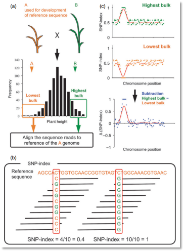 BSA(bulked segregant analysis)又叫集群分離分析法,該方法主要是選擇雙親群體分離后代中具有極端表型的個體進行混樣,通過比較不同極端混樣池之間的多態(tài)性標記的差異,從而篩選出與性狀相關(guān)的分子標記,實現(xiàn)目標基因的定位。BSA分析早期使用的都是傳統(tǒng)分子標記,根據(jù)標記與性狀共分離(緊密連鎖)得到定位區(qū)間,不過由于其標記密度低、定位精度差、實驗操作繁瑣已經(jīng)逐漸不再使用。近年來,BSA方法和高通量測序相結(jié)合,通過比較不同混池間SNP的頻率差異或者比較混池間純合SNP的密度的差異,實現(xiàn)基因的定位,高通量測序方式以其簡單、快速、準確、高性價比的特點受到科研工作者的青睞。那么,對于不了解BSA的研究者來說,如何快速了解BSA的發(fā)展歷程、原理方法、應(yīng)用領(lǐng)域,如何快速上手BSA分析,今天大師兄為大家推薦幾篇BSA代表性文章,讓你輕松搞定BSA,趕緊上車。