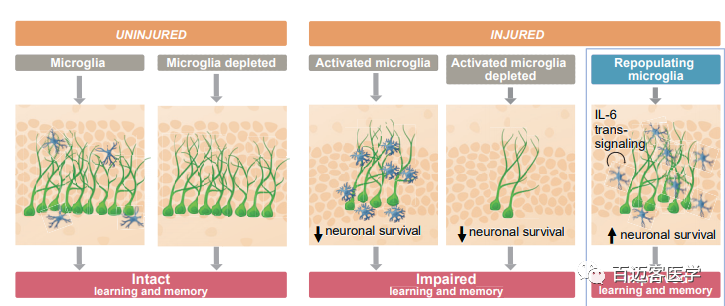 在受到損傷影響的大腦區(qū)域中,激活的小膠質(zhì)細(xì)胞的存在不一定對(duì)結(jié)果和/或認(rèn)知功能障礙有負(fù)面影響,相反,在受損傷后的大腦中,激活的小膠質(zhì)細(xì)胞似乎大多缺乏支持內(nèi)源性修復(fù)過(guò)程的能力。然而,在哺乳動(dòng)物的大腦中和再生生物體如蠑螈和斑馬魚(yú),可以誘導(dǎo)出一種可再生的小膠質(zhì)細(xì)胞表型,炎癥信號(hào)在其中發(fā)揮了關(guān)鍵作用。本文已經(jīng)發(fā)現(xiàn)了IL-6信號(hào)通路與這種有益表型相關(guān)的關(guān)鍵作用,未來(lái)的研究可以進(jìn)一步確定如何利用小膠質(zhì)細(xì)胞再生的獨(dú)特表型特征進(jìn)行治療。