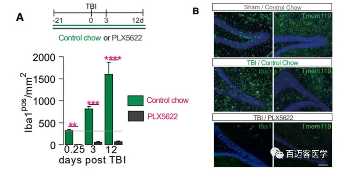 首先通過(guò)喂食小鼠集落刺激因子-1受體(CSF-1R)拮抗劑PLX5622 ,使小膠質(zhì)細(xì)胞衰竭,來(lái)檢查外傷性腦損傷(TBI)后小膠質(zhì)細(xì)胞缺失是否會(huì)改變海馬依賴任務(wù)中的認(rèn)知結(jié)果。用可控皮質(zhì)撞擊造成TBI,在腦外傷前3周開(kāi)始持續(xù)給藥PLX5622,可導(dǎo)致大范圍的Iba1pos?、TMEM119pos細(xì)胞的丟失,包括海馬區(qū)。在腦外傷后的整個(gè)實(shí)驗(yàn)時(shí)間內(nèi),海馬區(qū)保持95%的功能缺失。這些結(jié)果與喂食食物的小鼠對(duì)照組形成鮮明對(duì)比。在腦外傷后的12天內(nèi),海馬內(nèi)的Iba1pos細(xì)胞數(shù)量是假手術(shù)組的5倍。