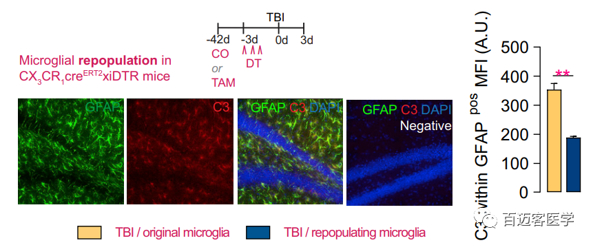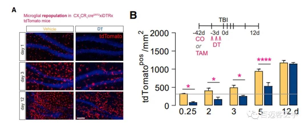 圖2A.遺傳模型鼠在停止注射DT和TBI后 小膠質(zhì)細(xì)胞(紅色)的再生