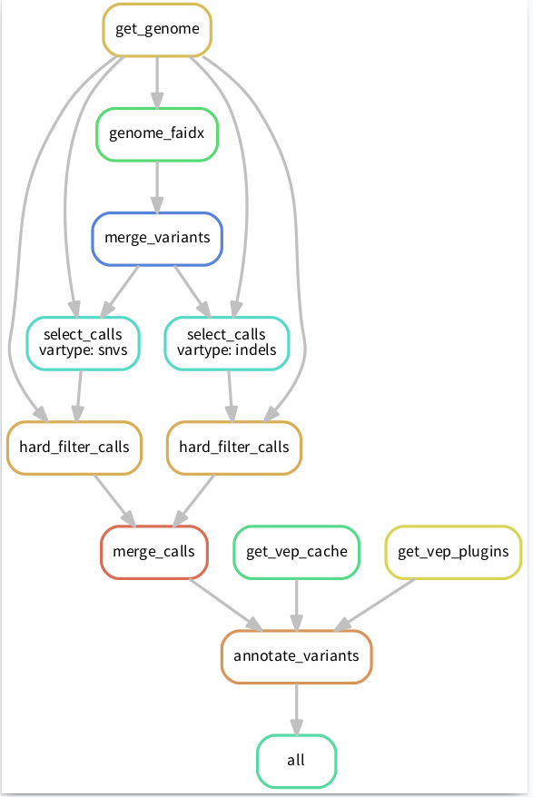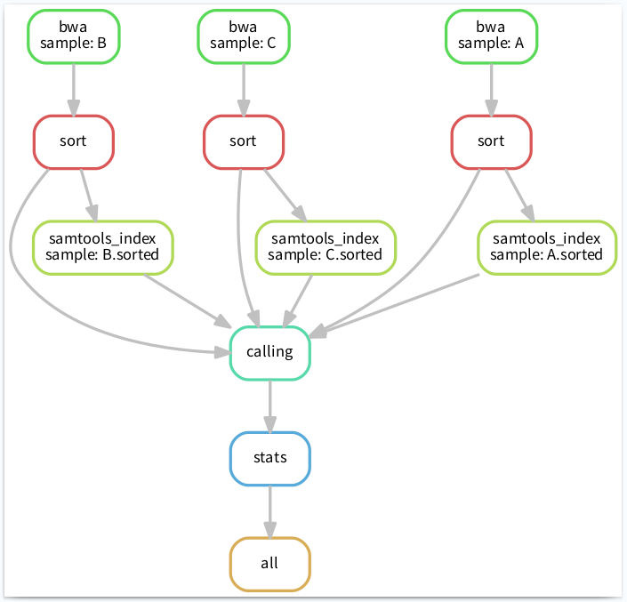 這時候就需要 Snakemake 閃亮登場了,因為snakemake可能是處理這類問題最簡單、有效的一個方法了。比如將流程像下圖這樣搭建起來,清晰明了: