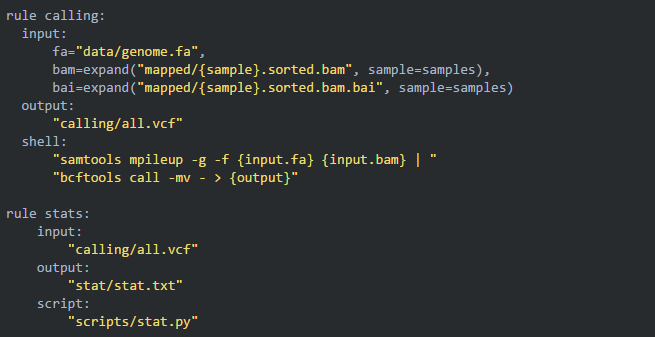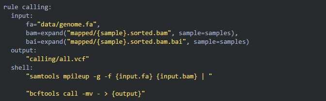 前面三步都是各個樣品批量、并行運行同樣的步驟,所以可以全部使用通配符 {sample} 完成匹配;但在變異檢測這一步需要將所有樣本的bam文件傳遞給一個命令而不再并行,這種方法就不在適用了。針對這種情況,snakemake 有它獨特的解決辦法: