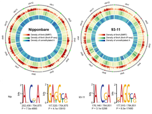 PacBio對(duì)粳稻Nip與秈稻93-11基因組更新:利用PacBio對(duì)Nip和93-11進(jìn)行測(cè)序及Illumina平臺(tái)進(jìn)行g(shù)ap填充和誤差校正后,Nip基因組大小為380.7 Mb(contig N50=16.97 Mb),93-11基因組大小為396 Mb(contig N50=9.64 Mb);進(jìn)一步通過(guò)SMRT(單分子實(shí)時(shí)測(cè)序系統(tǒng)Single MoleculeReal Time)測(cè)序數(shù)據(jù),在Nip和93-11中分別檢測(cè)出704875個(gè)和784912個(gè)6mA位點(diǎn)。