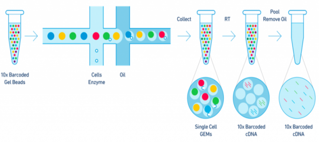 單細(xì)胞測(cè)序,簡(jiǎn)而言之,就是獲取單個(gè)細(xì)胞遺傳信息的測(cè)序技術(shù),其中10 X Genomics單細(xì)胞轉(zhuǎn)錄組測(cè)序平臺(tái)具有廣泛的應(yīng)用。該技術(shù)利用微流控、油滴包裹和barcode標(biāo)記等技術(shù)來(lái)實(shí)現(xiàn)高通量的細(xì)胞捕獲技術(shù),能夠一次性分離、并標(biāo)記500–10000個(gè)單細(xì)胞,從而獲得每個(gè)細(xì)胞的3’端的轉(zhuǎn)錄組信息。主要用于細(xì)胞分型和標(biāo)記因子的鑒定,從而實(shí)現(xiàn)對(duì)細(xì)胞群體的劃分與細(xì)胞群體間基因表達(dá)差異的檢測(cè),此外該技術(shù)還可以預(yù)測(cè)細(xì)胞分化與研究發(fā)育軌跡,在當(dāng)下疾病、免疫、腫瘤領(lǐng)域以及組織、器官、動(dòng)植物發(fā)育研究中發(fā)揮越來(lái)越重要的作用。