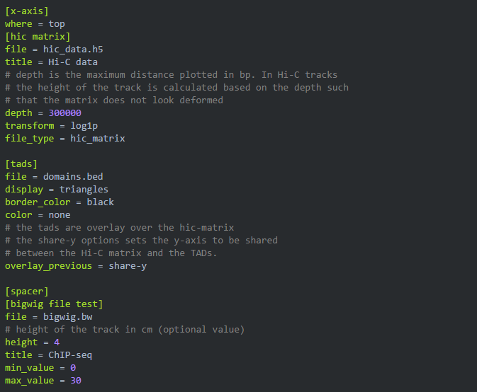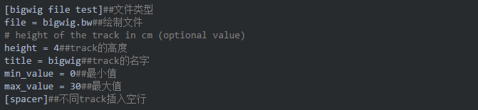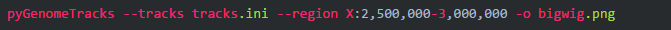 ?pyGenomeTracks首先生成繪圖文件,bigwig、bed、Hi-C文件,然后根據(jù)繪圖文件生成配置文件name.ini; 最后使用pyGenomeTracks命令對特定區(qū)域生成相應(yīng)的結(jié)果文件。具體的使用方法如下: